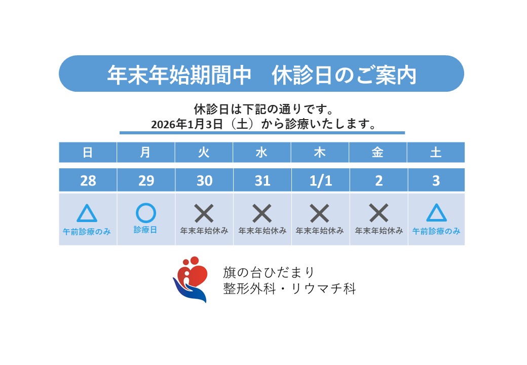 年末の診療は12/29(日)[午前のみ]、年始は1/3(火)[午前のみ]より診療を開始します。***********